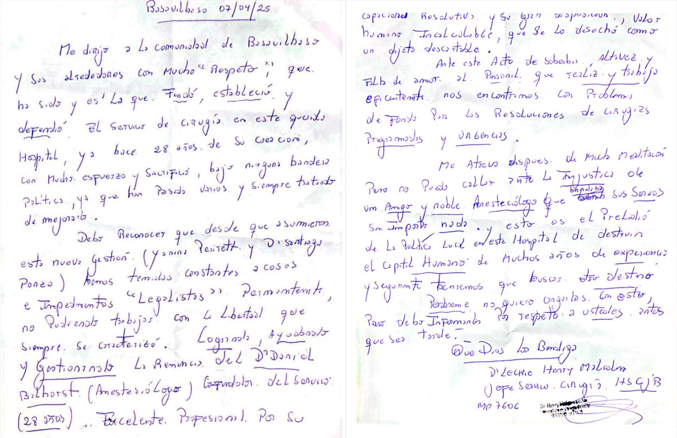 Sociedad | El médico cirujano Henry Leckie envió una carta escrita de puño y letra a la radio de Basavilbaso, expresando su preocupación por la rapidez con la que se aceptó la renuncia del Dr. Daniel Balhorst, un estimado anestesiólogo y “amigo”. Leckie denuncia un supuesto plan para “destruir el capital humano acumulado” y señala a la actual gestión hospitalaria como responsable de este conflicto.