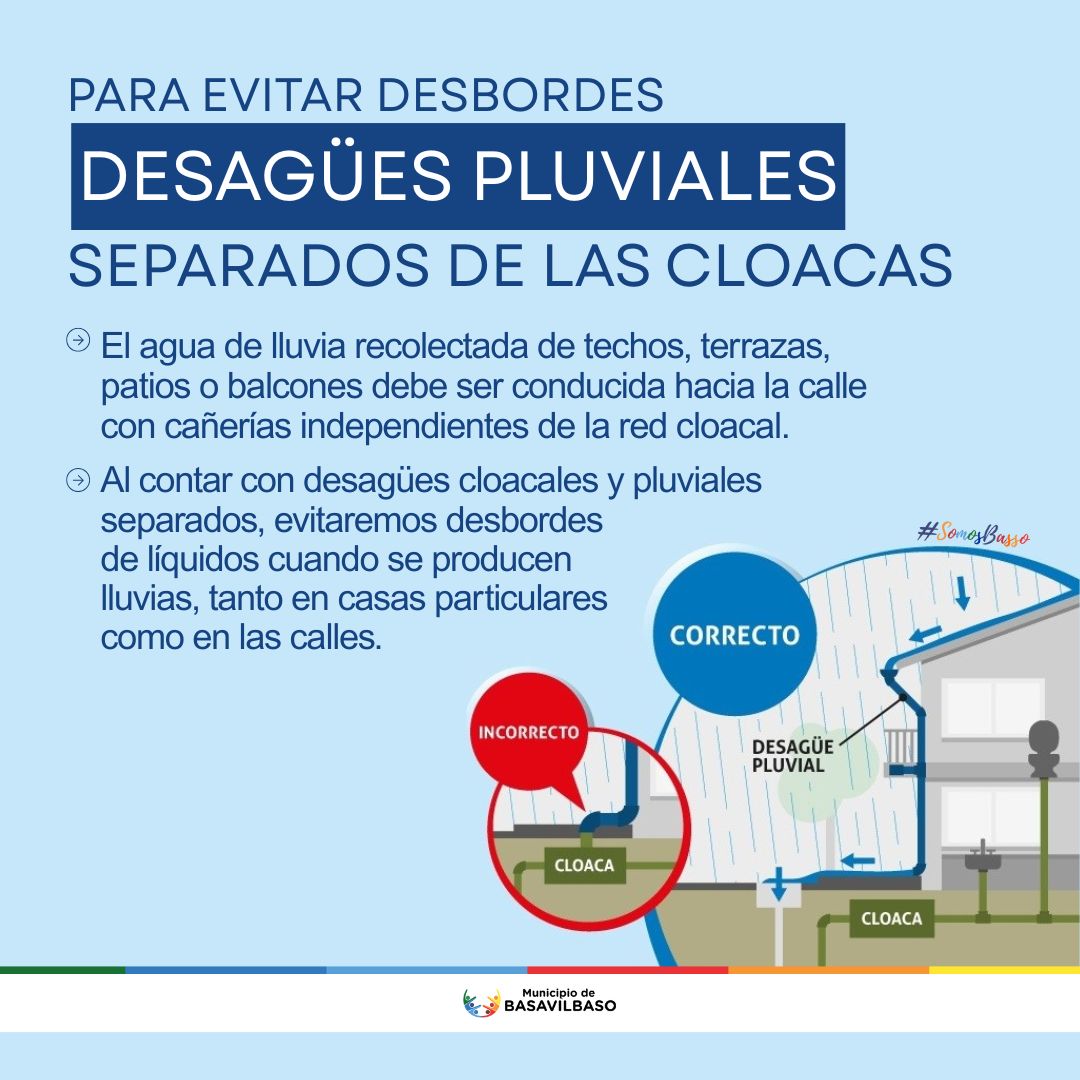 “Cada propietario, tenedor o poseedor de inmuebles ubicado en el ámbito o competencia del municipio de Basavilbaso revisará el funcionamiento del sistema pluvial de dicho inmueble, verificando que techos, patios, veredas y todo otro drenaje que esté permitido vuelque en los desagües pluviales y no en los cloacales. Si el propietario, tenedor o poseedor estableciera funcionamiento inadecuado del sistema pluvial de su inmueble, deberá proceder por su cuenta y responsabilidad a la reparación de la anomalia”, se recuerda