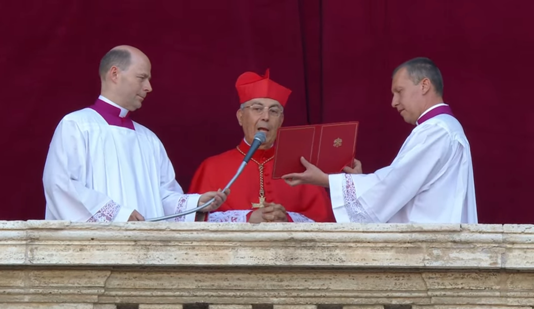 Ante los fieles congregados en la plaza San Pedro el Cardenal Protodiácono Dominique Mamberti apareció en el balcón central de la Basílica de San Pedro desde donde pronunciar el tradicional "Habemus Papam", y anunció oficialmente al nuevo jefe de la Iglesia Católica, el Papa 267° de la historia de la institución más antigua de la que se tiene registro en el mundo.
