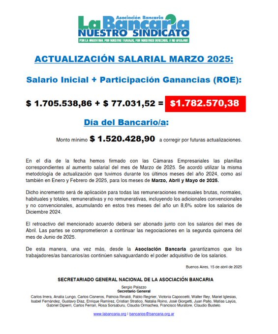 Política | La Asociación Bancaria acordó un salario inicial de los trabajadores del sector de $1.782.570,38 a partir de marzo, tras alcanzar un nuevo acuerdo paritario con las cámaras empresarias.
