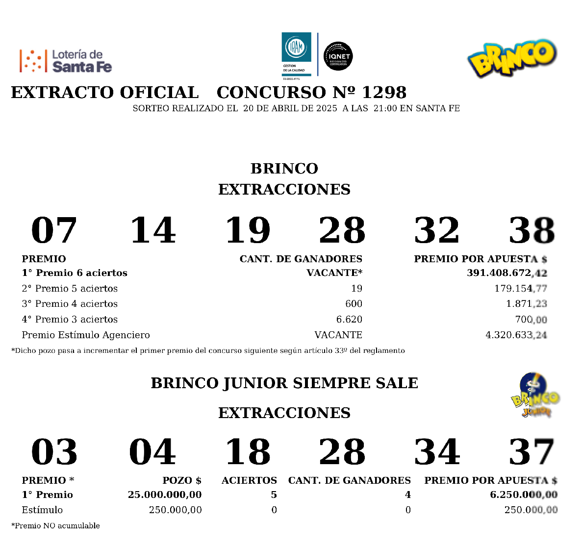 En el Brinco, concurso 1.298 sorteo del domingo 20 de abril con seis aciertos $391.408.672 quedó vacante.