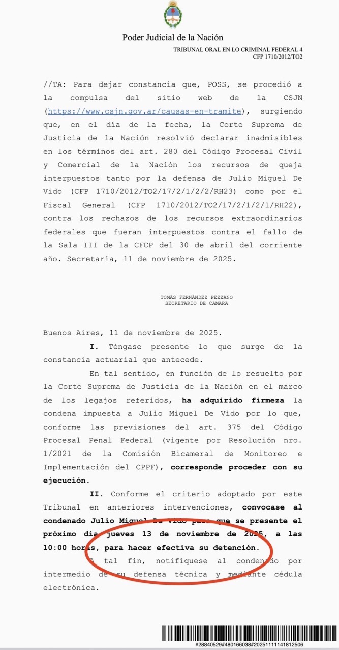 Asimismo, De Vido fue absuelto del delito de estrago culposo agravado, que implicaba responsabilidades por las 52 muertes de la tragedia. De Vido debe presentarse el jueves 13 de noviembre a las 10 en los tribunales de la calle Comodoro Py para que se haga efectiva su detención.