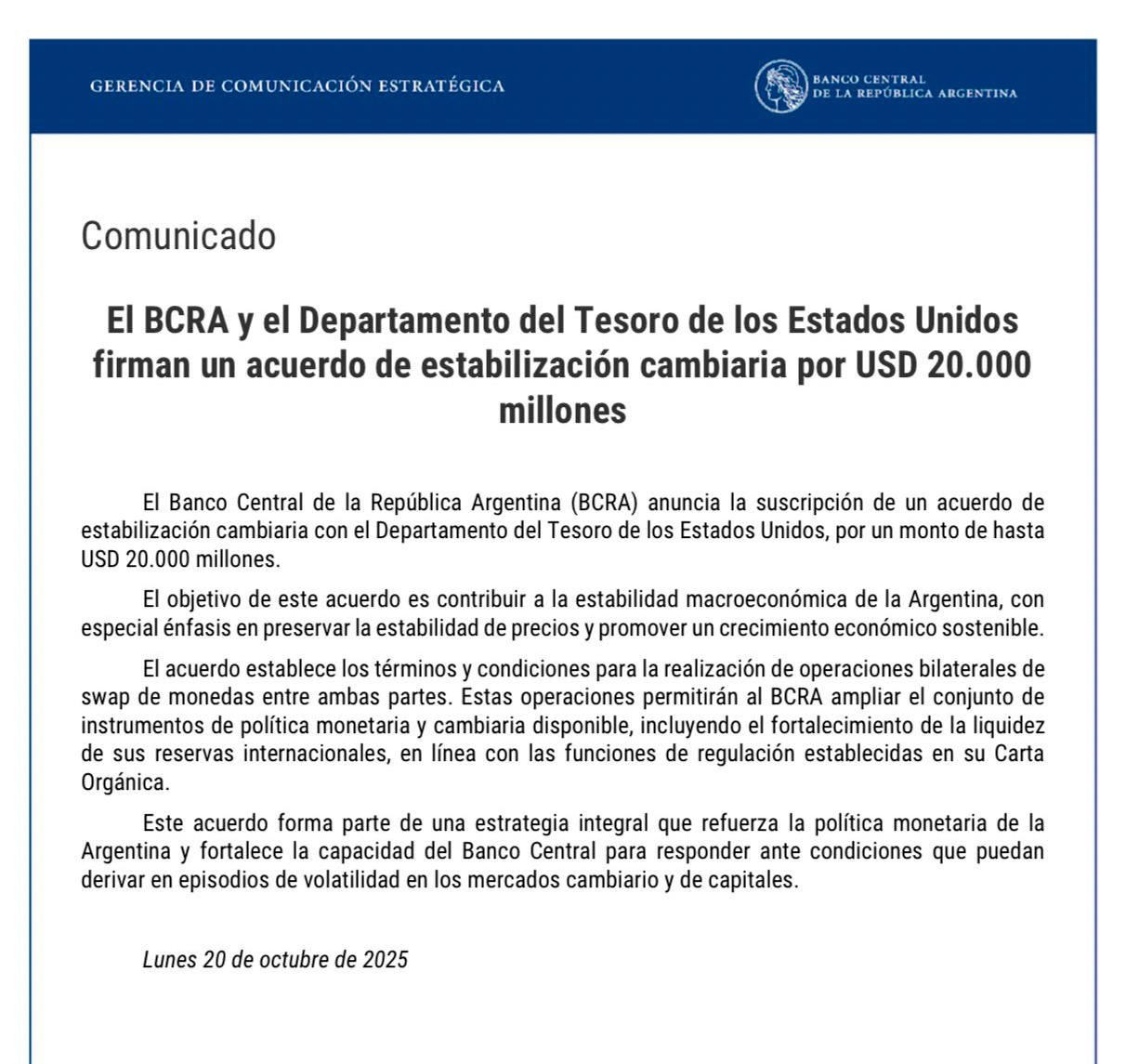 El Banco Central de la República Argentina (BCRA) anunció la firma de un acuerdo de estabilización cambiaria con el Departamento del Tesoro de Estados Unidos, por un monto de hasta 20.000 millones de dólares, confirmando así el swap de monedas previamente informado por la administración de Donald Trump.