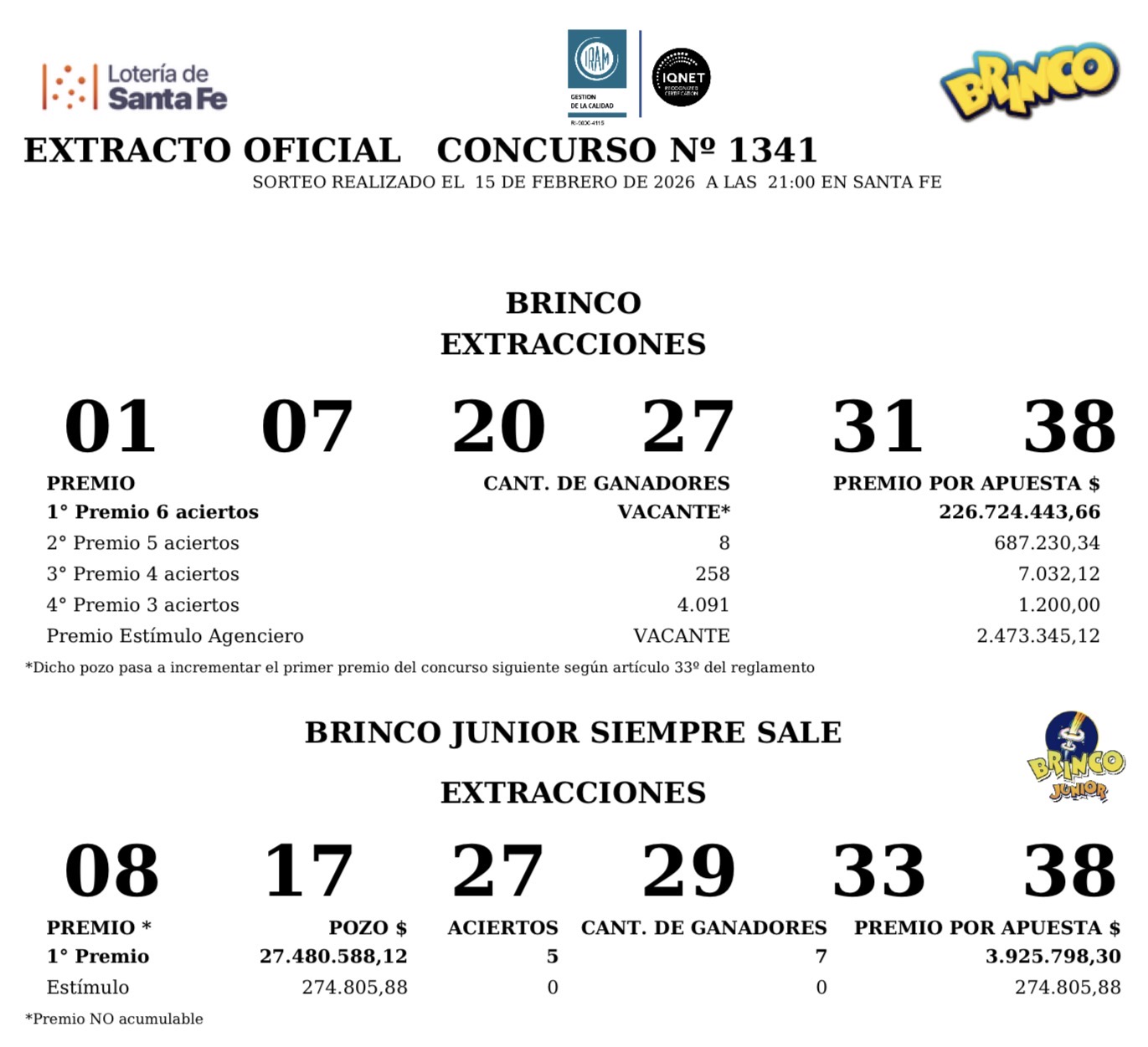 El Brinco, concurso 1.341 sorteo del domingo 15 de febrero con seis aciertos el pozo vacante $226.724.244.