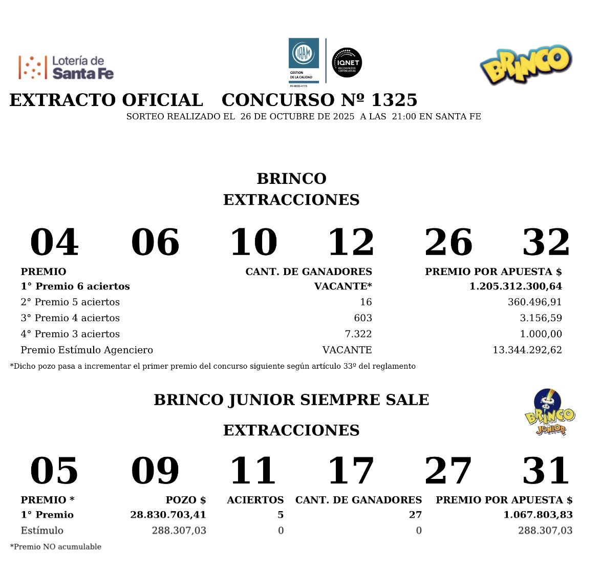 El Brinco, concurso 1.325 sorteo del domingo 26 de octubre con seis aciertos $1.205.312.300 quedó vacante.