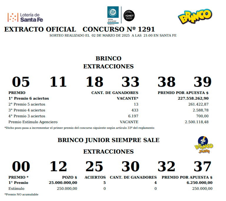 En el Brinco, concurso 1.291 sorteo del domingo 2 de marzo con seis aciertos $227.558.267 quedó vacante.