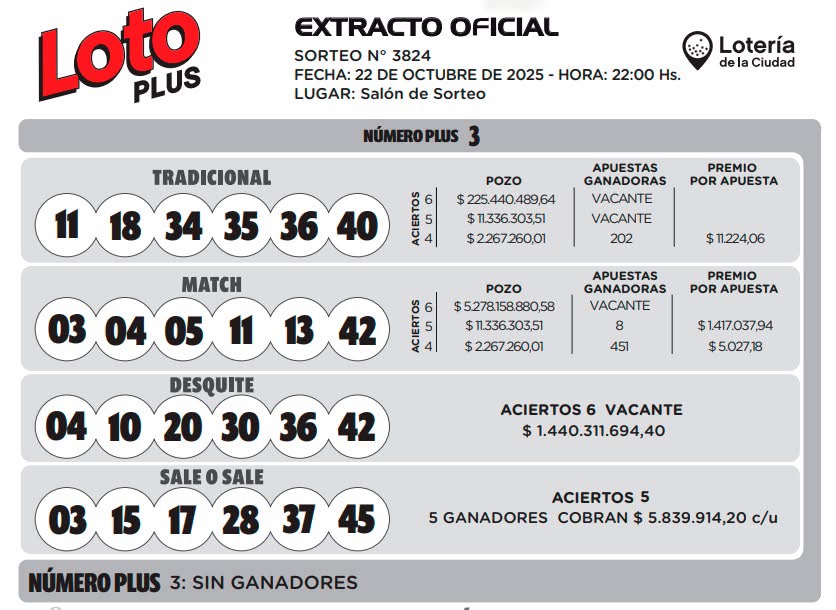 Sociedad | Este miércioles, 22 de octubre, en el sorteo Tradicional del Loto Plus su pozo quedó vacante, como en el resto de las versiones. El Sale o Sale fue para cinco ganadores.