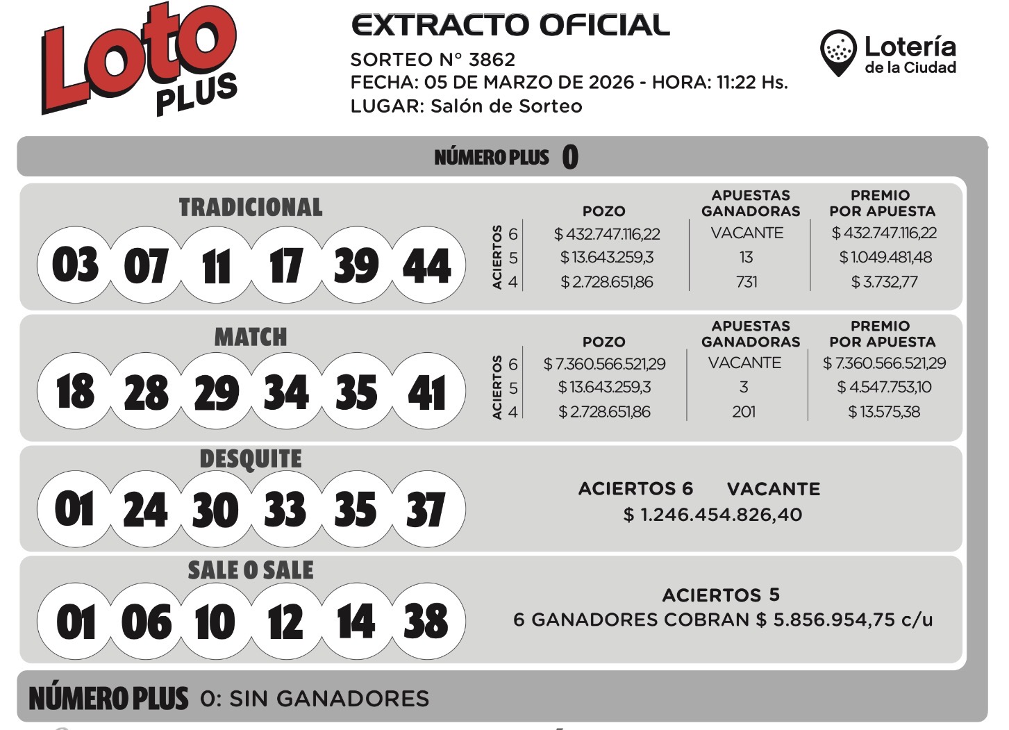Sociedad | Este jueves, 5 de marzo, el sorteo Tradicional del Loto Plus pozo quedó vacante, al igual que las versiones Match y Desquite. Con el Sale o Sala hubo 6 ganadores.