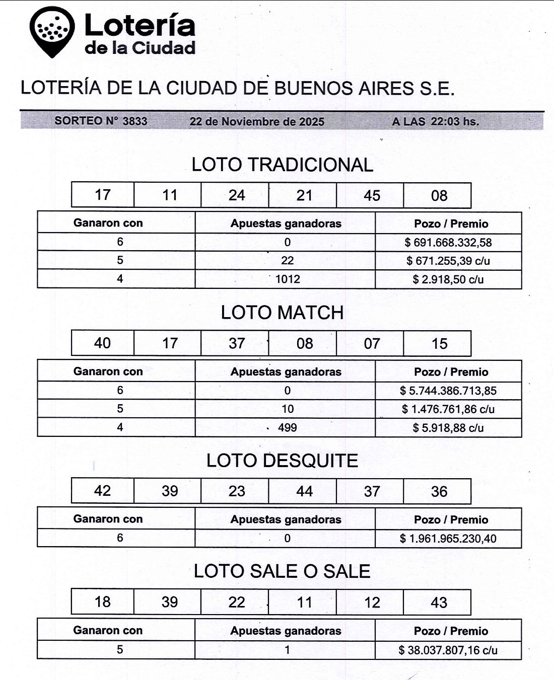 En el Desquite aparecieron el 23 - 36 - 37 - 39 - 42 - 44.