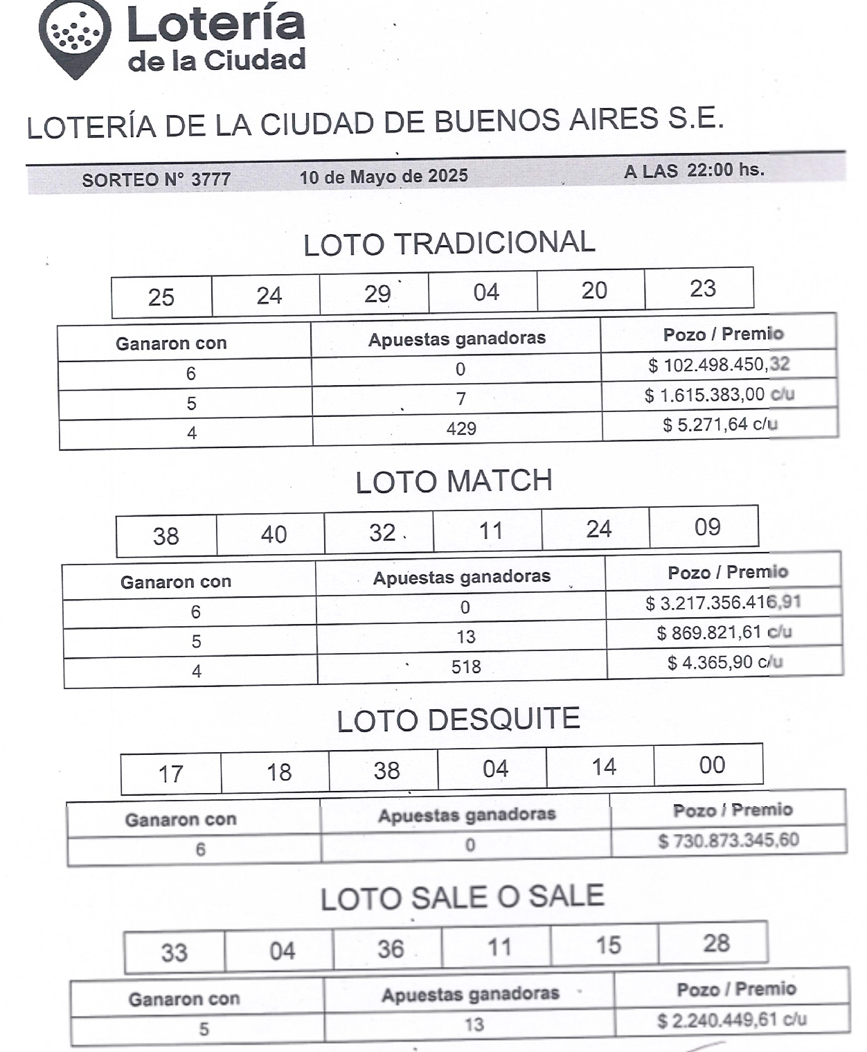 El sorteo del Loto Plus 3.777 realizado el sábado 10 de mayo en la versión Tradicional con un pozo de $102.498.450 quedó vacante.