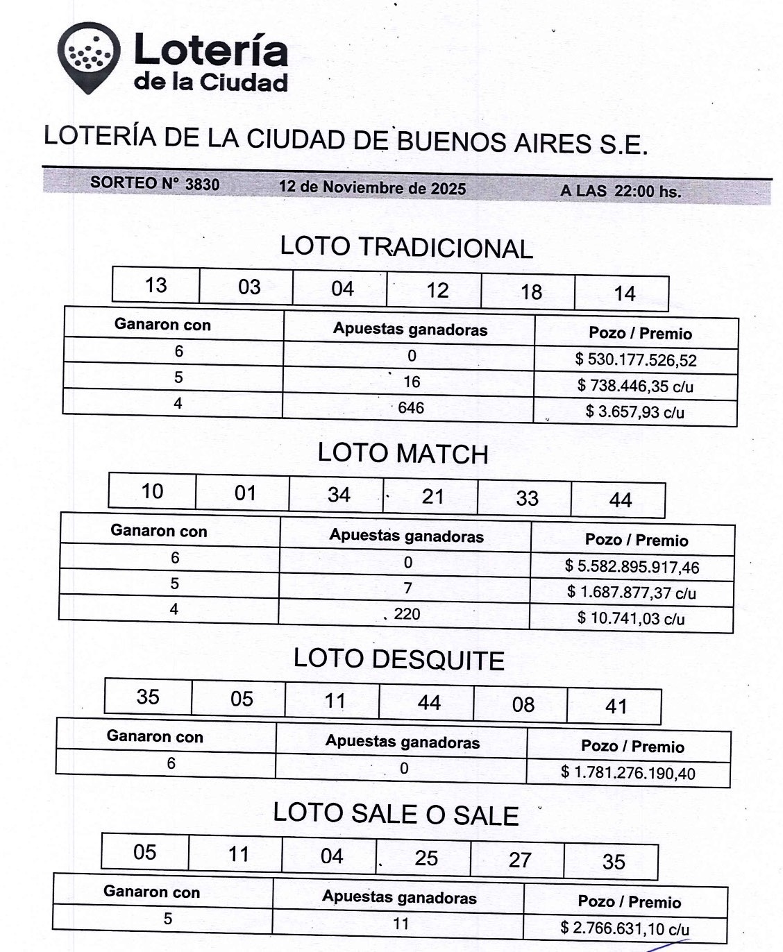 Sociedad | Este miércoles 12 de noviembre, en el sorteo Tradicional del Loto Plus su pozo quedó vacante, como en el resto de las versiones. El Sale o Sale fue para once ganadores.