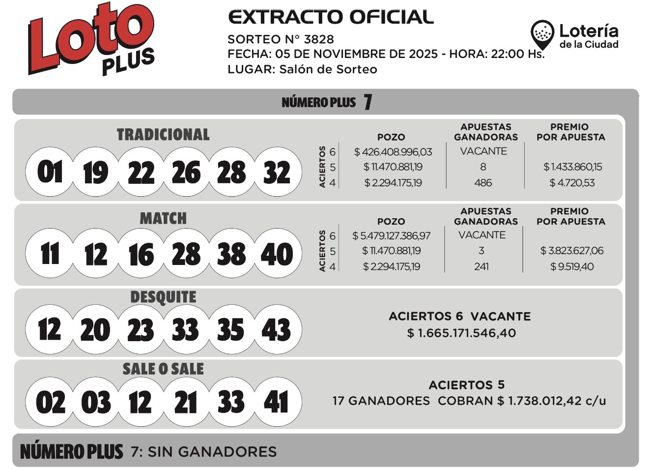 Sociedad | Este miércoles 5 de noviembre, en el sorteo Tradicional del Loto Plus su pozo quedó vacante, como en el resto de las versiones. El Sale o Sale fue para diecisiete ganadores.