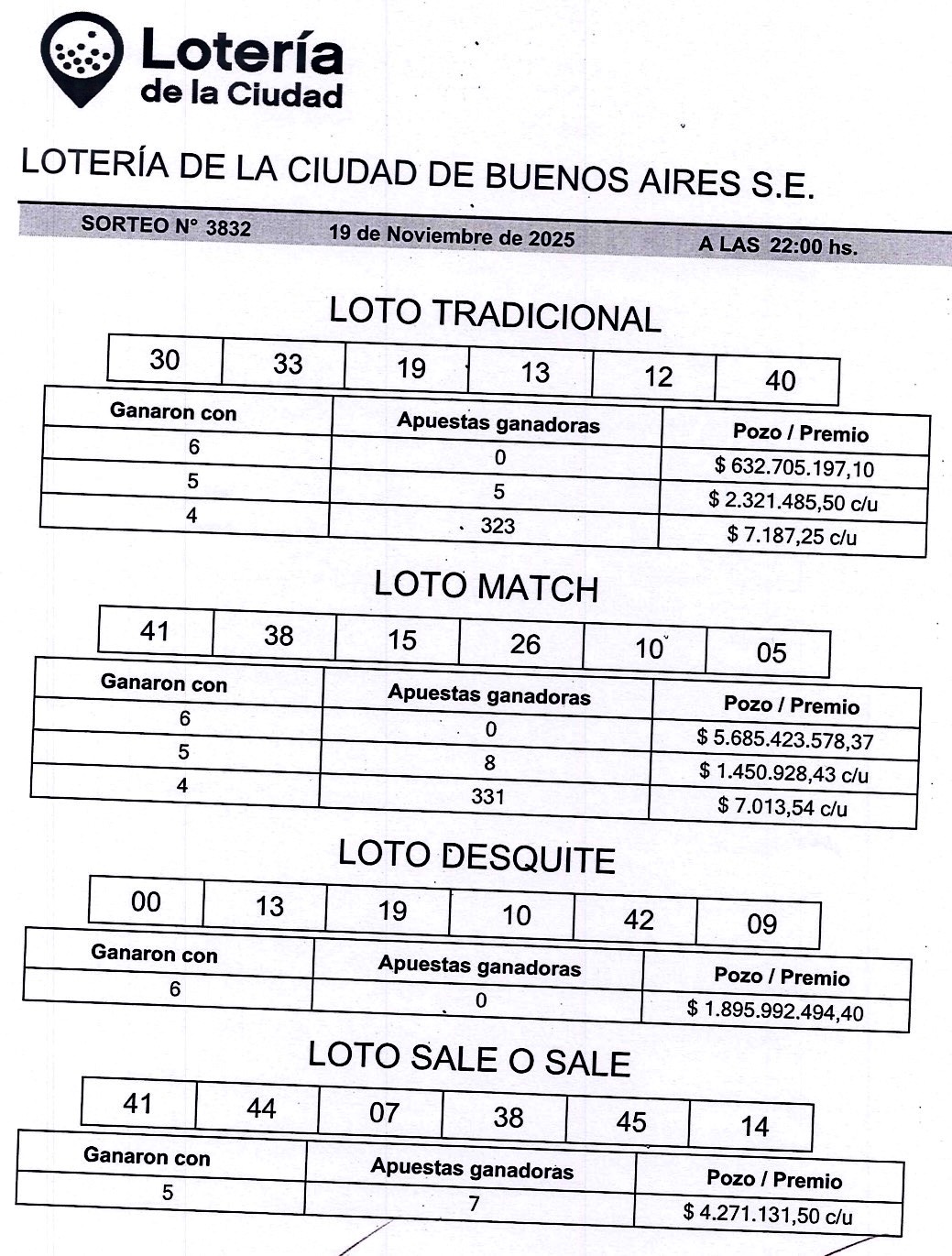 En el Desquite aparecieron el 00 - 09 - 10 - 13 - 19 - 42.