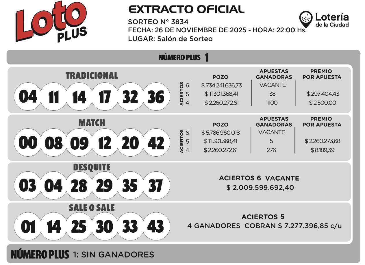Sociedad | Este miércoles 26 de noviembre, en el sorteo Tradicional del Loto Plus su pozo quedó vacante, como en el resto de las versiones. El Sale o Sale fue para cuatro ganadores.