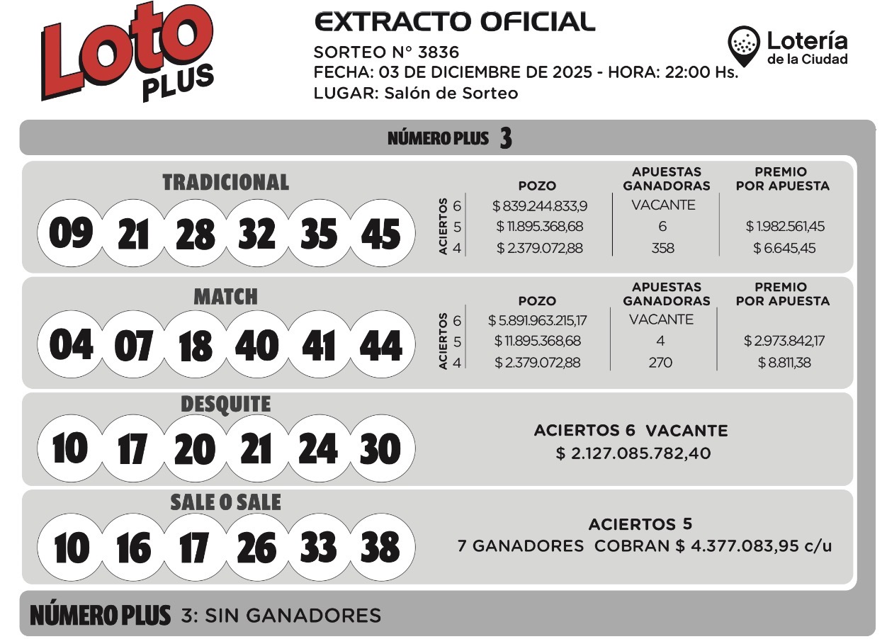 Sociales | Este miércoles 3 de diciembre, en el sorteo Tradicional del Loto Plus su pozo quedó vacante, como en el resto de las versiones. El Sale o Sale fue para siete ganadores.