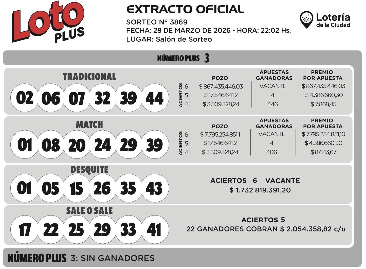 Este sábado 28 de marzo en el sorteo Tradicional del Loto Plus salieron 02 - 06 - 07 - 32 - 39 - 44.