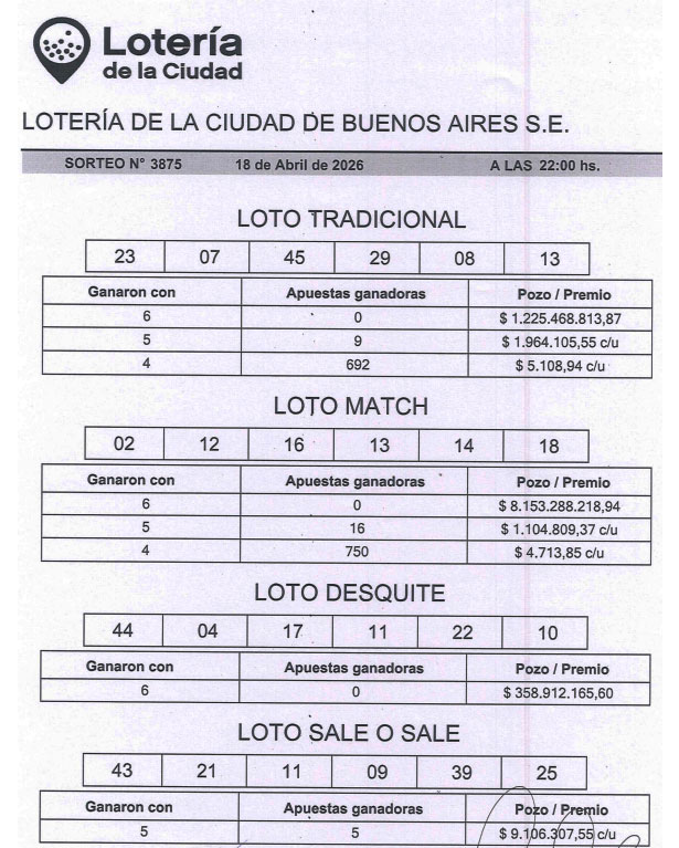 Este sábado 18 de abril en el sorteo Tradicional del Loto Plus salieron 07 - 08 - 13 - 23 - 29 - 45.