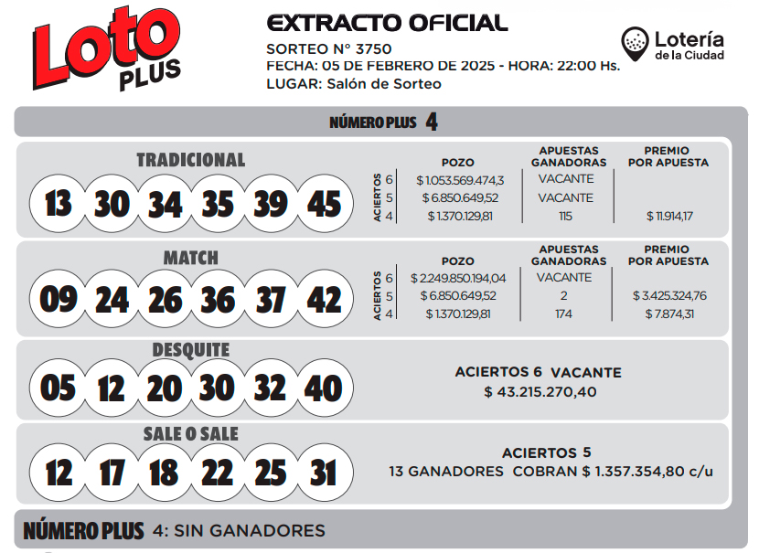 El sorteo del Loto Plus 3.750 realizado el miércoles 5 de febrero en la versión Tradicional $1.053.569.474vacante.
