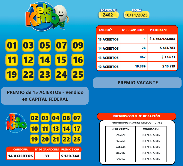 Sociedad | Aquí el resultado del sorteo 2.402 del Telekino que en su versión tradicional con un pozo de más de $3.700 millones quedó en manos de un apostador, mientras que el pozo del Rekino fue para 33 afortunados.