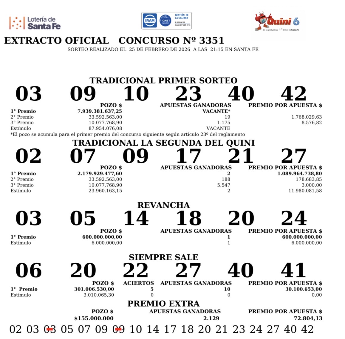 En el sorteo del Quini 6 realizado este miércoles, 25 de febrero, no se registraron ganadores en la modalidad Tradicional, los números que salieron fueron el 40-42-09-10-23-03. Al no haber apostadores con seis aciertos, el pozo quedó vacante y se acumularon $7.939.381.637. para el sorteo del próximo domingo.