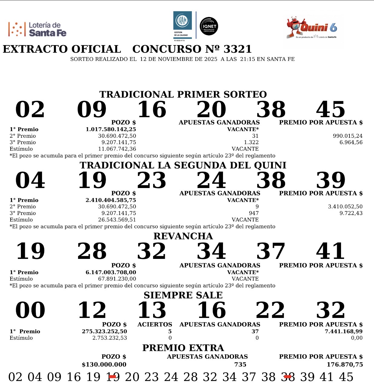 Este miércoles 12 de noviembre se sorteó el concurso N° 3.321 del Quini 6, de la Lotería de Santa Fe.