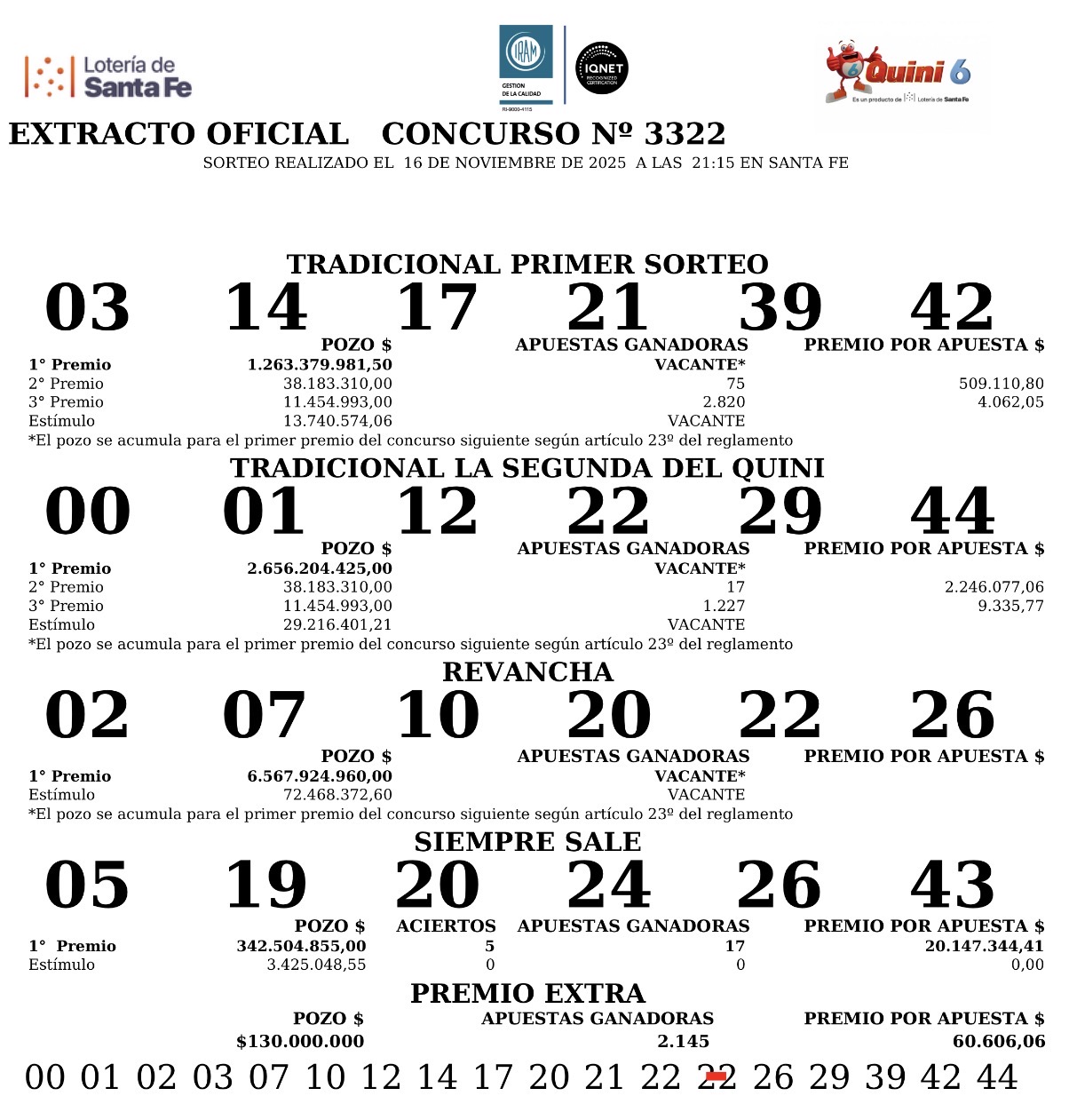 Este domingo 16 de noviembre se sorteó el concurso N° 3.322 del Quini 6, de la Lotería de Santa Fe.