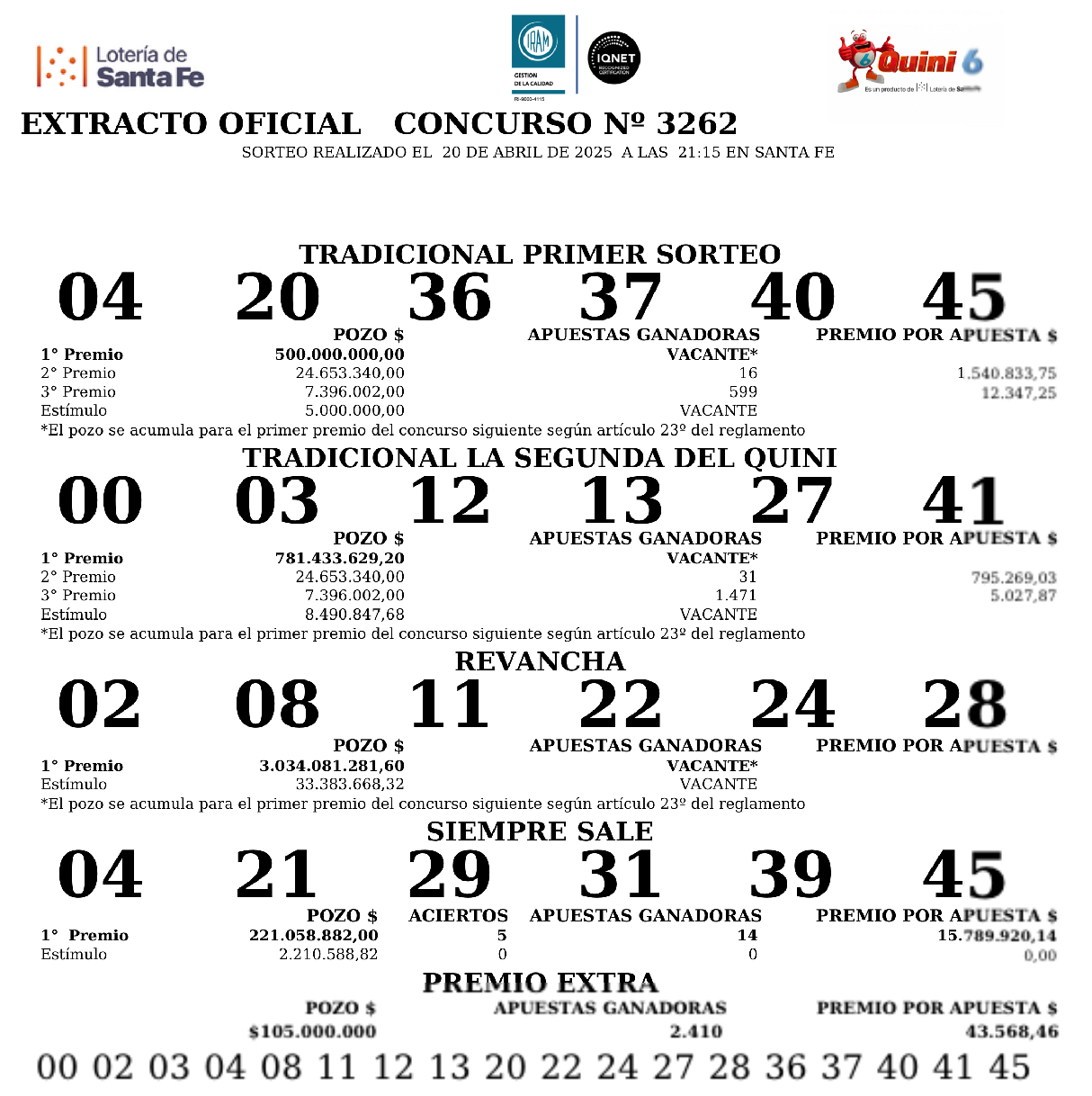 Este domingo, 20 de abril, en el sorteo Tradicional del Quini 6 salieron el 04-20-36-37-40-45, el pozo de $500.000.000 quedó vacante.