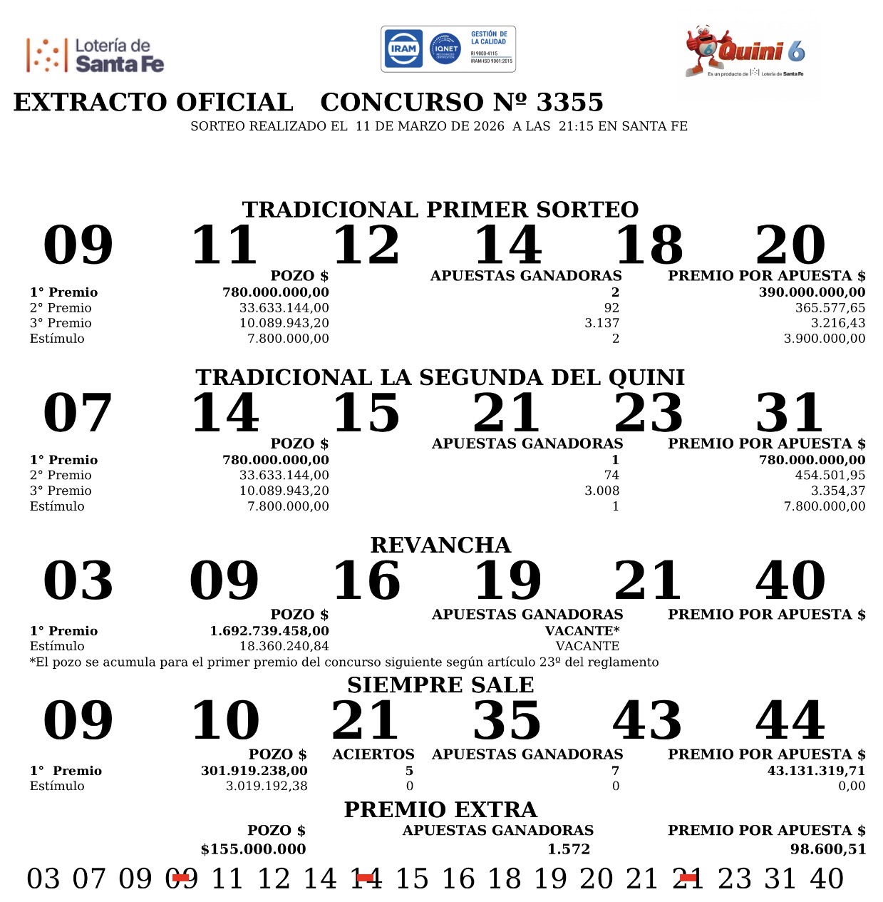 Por su parte, en La Segunda, los números favorecidos fueron 07-14-15-21-23-31. El pozo $780.000.000 quedó en manos de un apostador de Villa Ángela (Chaco).