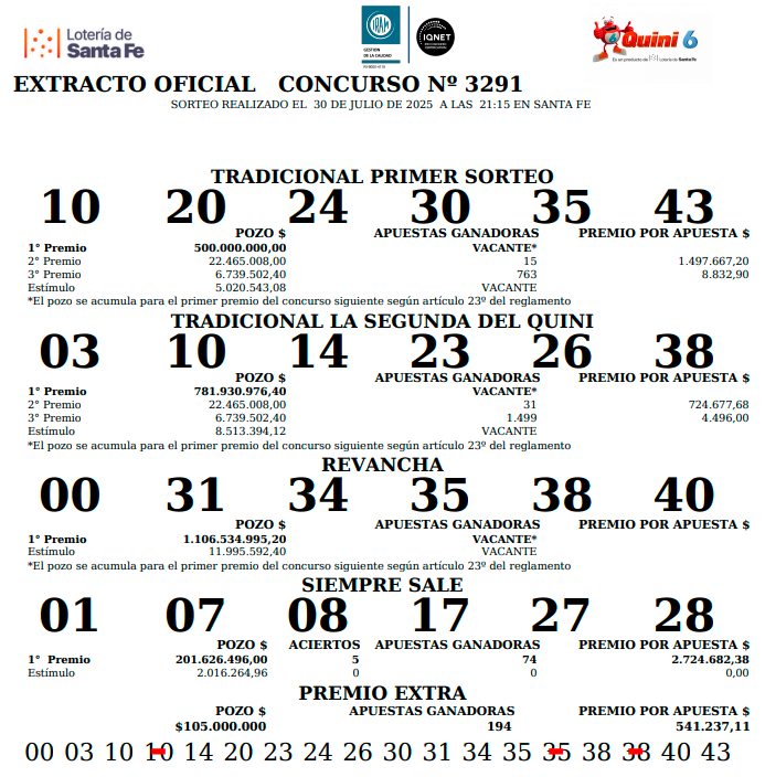 Este miércoles 30 de julio en el sorteo Tradicional del Quini 6 salieron el 10-20-24-30-35-43, el pozo de $500.000.000 quedó vacante.