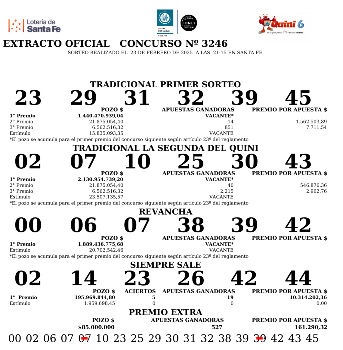 En el caso de La Segunda los números favorecidos fueron 01-05-17-22-23-32. No hubo ganadores en este sorteo y para el próximo se acumulan $2.240.261.342.
