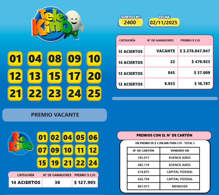 Sociedad | Aquí el resultado del sorteo 2.400 del Telekino que en su versión tradicional el pozo de más de $3.300 millones quedó vacante, mientras que el pozo del Rekino fue para 30 afortunados.