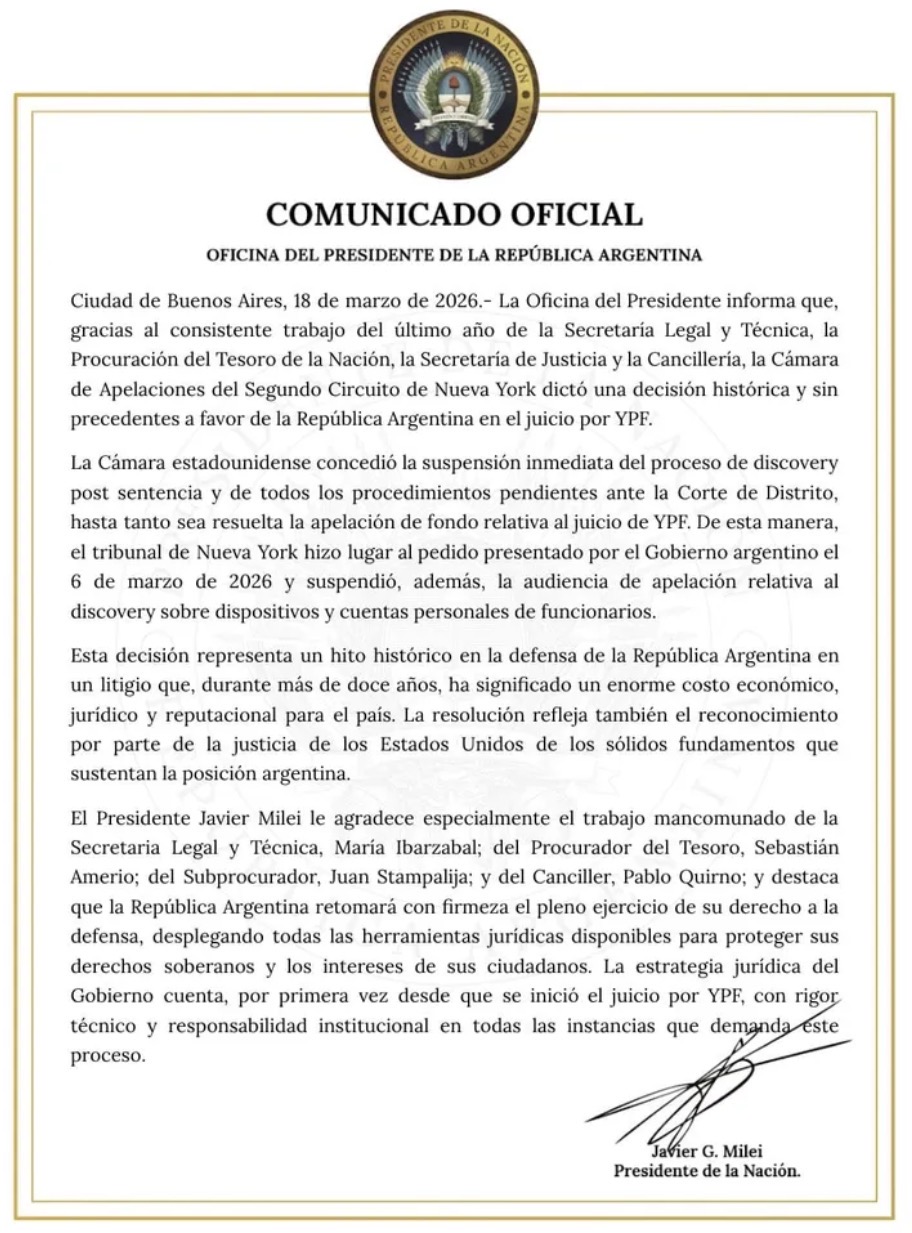 El Presidente Javier Milei celebró este miércoles la “sentencia histórica y sin precedentes” a favor de la Argentina en el juicio por YPF que se tramita en los tribunales de Nueva York.
