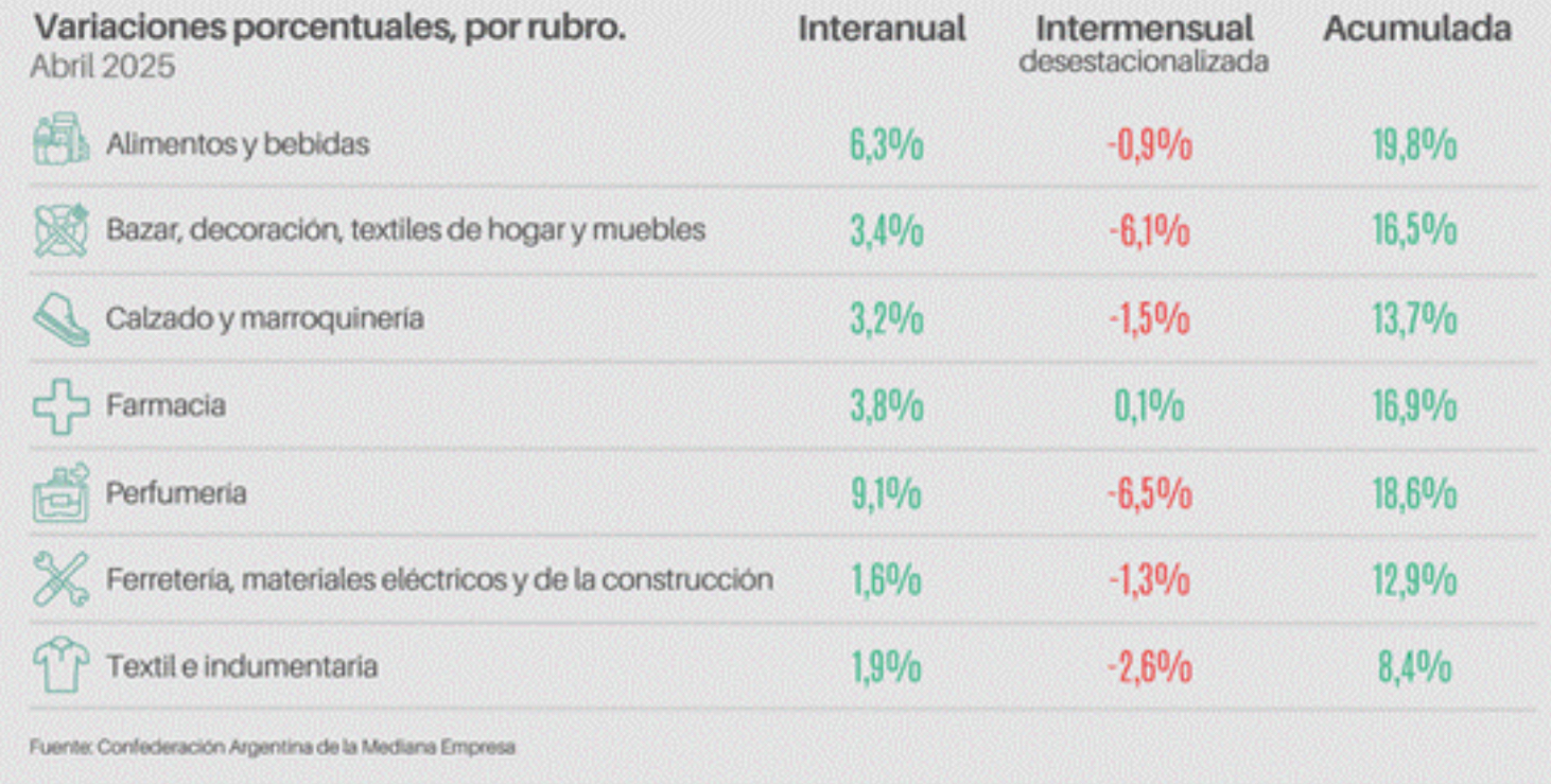 Todos los rubros relevados registraron subas interanuales en sus ventas. El crecimiento más fuerte se dio nuevamente en Perfumería, con un 9,1%, seguido por Alimentos y bebidas, con un 6,3%.