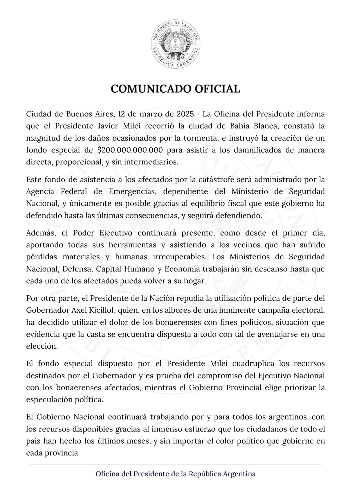 "La Oficina del Presidente informa que el Presidente Javier Milei recorrió la ciudad de Bahía Blanca, constató la magnitud de los daños ocasionados por la tormenta, e instruyó la creación de un fondo especial de $200.000.000.000 para asistir a los damnificados de manera directa, proporcional, y sin intermediarios", indicaron desde la Oficina del Presidente.
