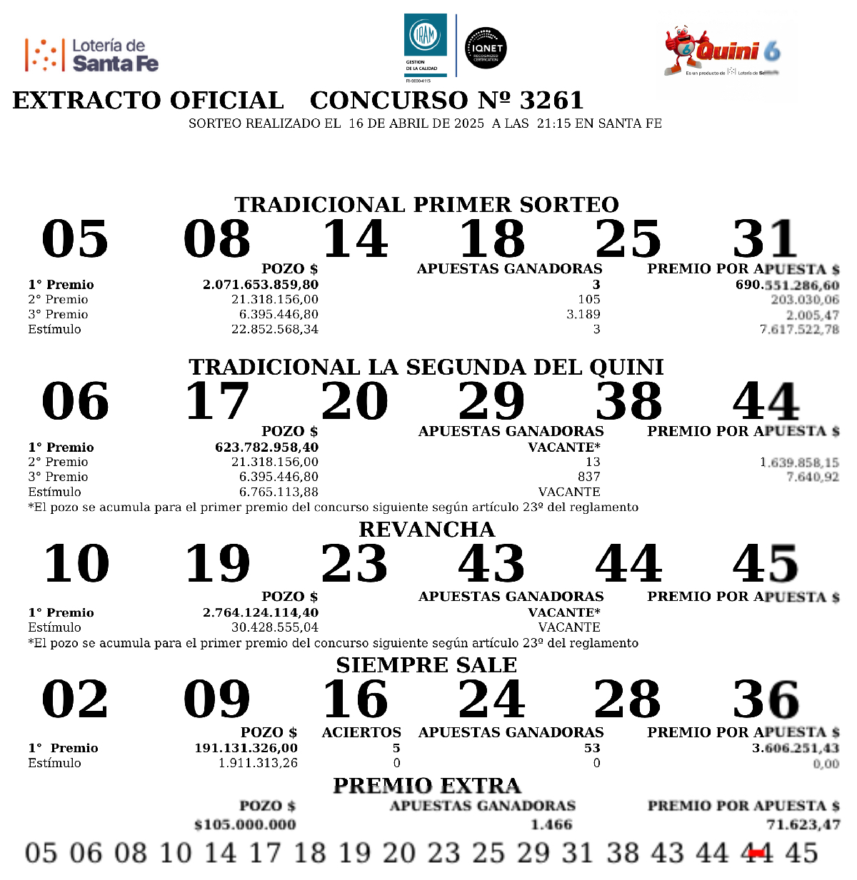 Este miércoles, 16 de abril, en el sorteo Tradicional del Quini 6 salieron el 05-08-14-18-25-31, el pozo quedó en manos de 3 apostadores. Villa Regina, provincia de Río Negro; Itatí, provincia de Corrientes y Sarmiento, provincia de Chubut, que cobrarán cada uno $690.551.286.