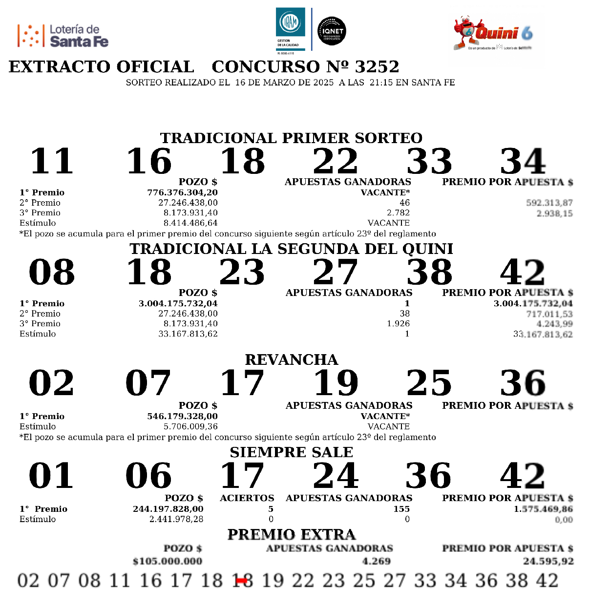 En el caso de La Segunda los números favorecidos fueron 08-18-23-27-38-42. Hubo un ganador, que hizo su apuesta en CABA, y se lleva el pozo de $3.004.175.732.