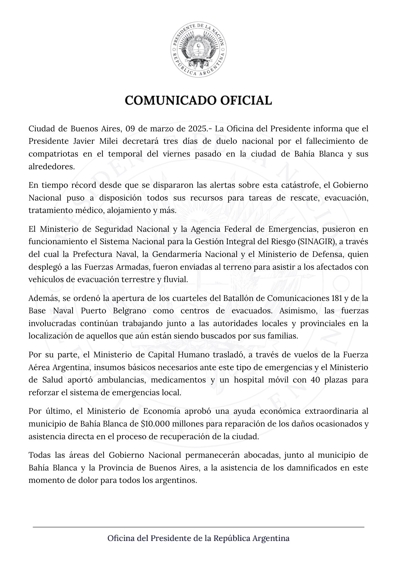 Todas las áreas del Gobierno nacional permanecerán abocadas, junto al municipio de Bahía Blanca y la Provincia de Buenos Aires, a la asistencia de los damnificados en este momento de dolor para todos los argentinos, señaló la Oficina del Presidente.