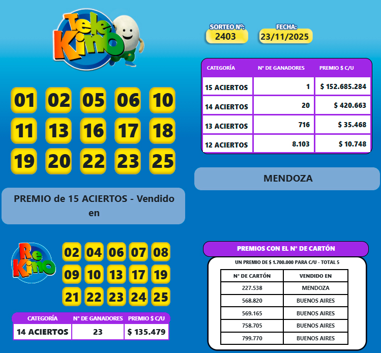 Sociedad | Aquí el resultado del sorteo 2.403 del Telekino que en su versión tradicional con un pozo de más de $150 millones quedó en manos de un apostador, oriundo de Mendoza, mientras que el pozo del Rekino fue para 23 afortunados.
