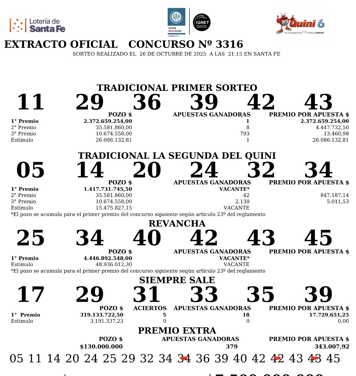 Este domingo 26 de octubre se sorteó el concurso N° 3.316 del Quini 6, de la Lotería de Santa Fe.