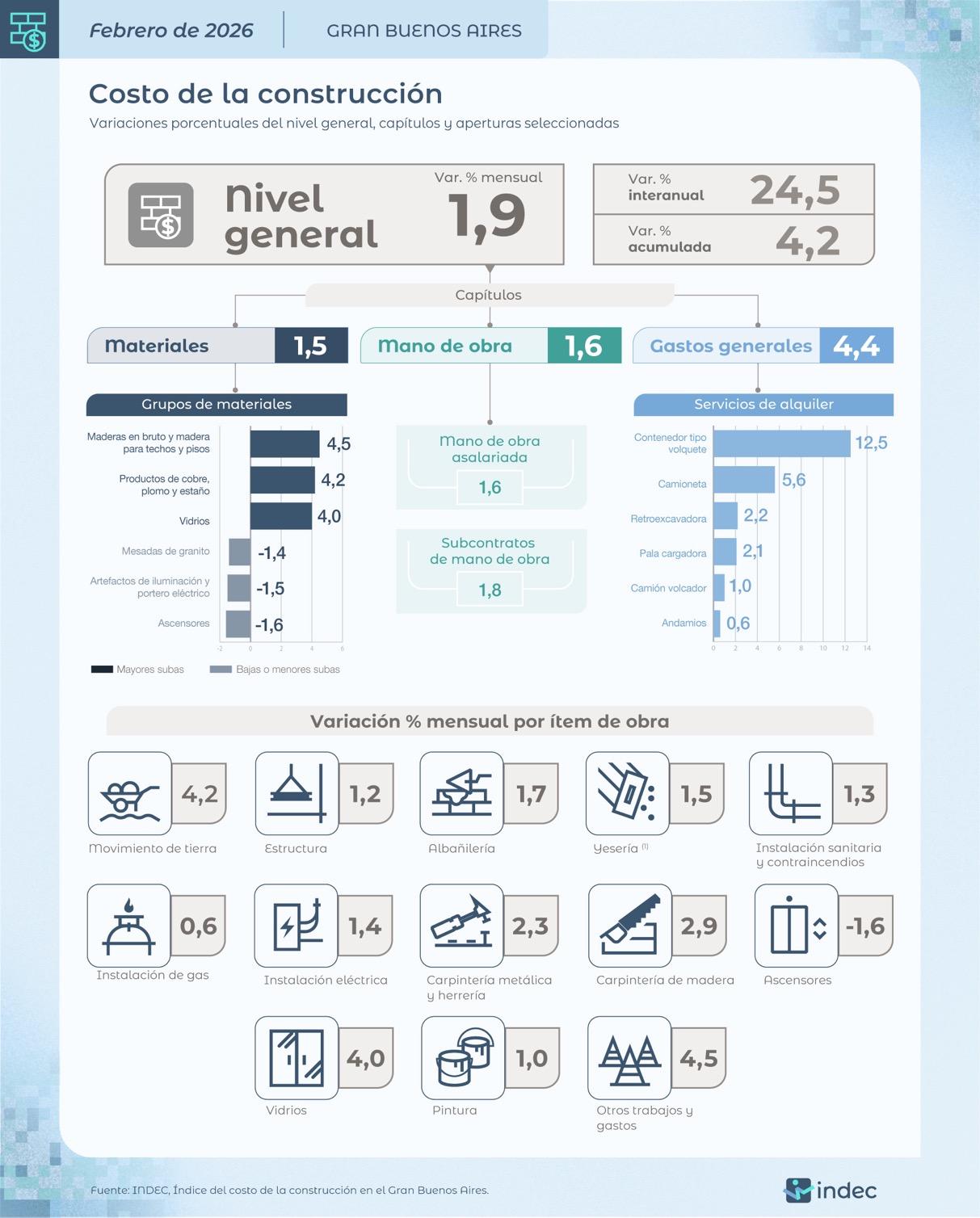 El costo de la construcción subió 1,9% en febrero