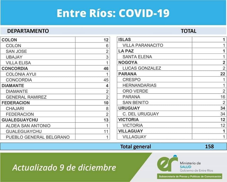 A partir de los datos reportados al 9 de diciembre de 2020 por el área de Vigilancia Epidemiológica del Ministerio de Salud, en Entre Ríos se han sumado 158 casos de coronavirus.