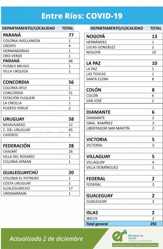 Salud | El área de Vigilancia Epidemiológica del Ministerio de Salud, confirmó que en Entre Ríos este miércoles se registraron 292 nuevos casos. El número de infectados, desde que comenzó la pandemia, asciende a 24.479 casos.