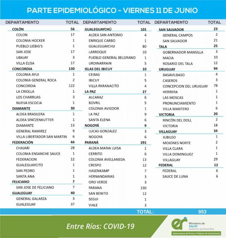 Los casos del Departamento Uruguay 94, distribuidos 4 en Basavilbaso; 6 en Villa Mantero; 1 en Las Moscas; 1 en Herrera; 3 en Caseros; 1 en Pronunciamiento y 78 en Concepción del Uruguay.