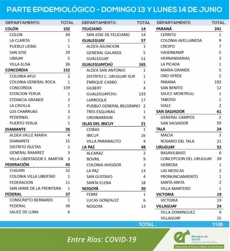 El área de Vigilancias Epidemiológica del Ministerio de Salud, confirmó que en Entre Ríos se registraron 1.108, nuevos casos de coronavirus, los que se dividen en 702 el domingo y 406 el lunes.