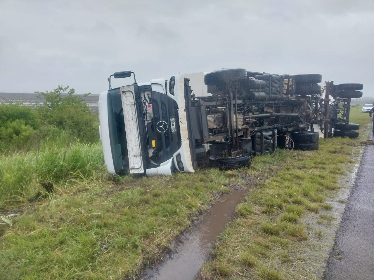 Un camión con acoplado -utilizado para el transporte de alimentos para pollos- volcó este viernes poco antes de las 11:30, en el kilómetro 110,5 de la Ruta Provincial 20.