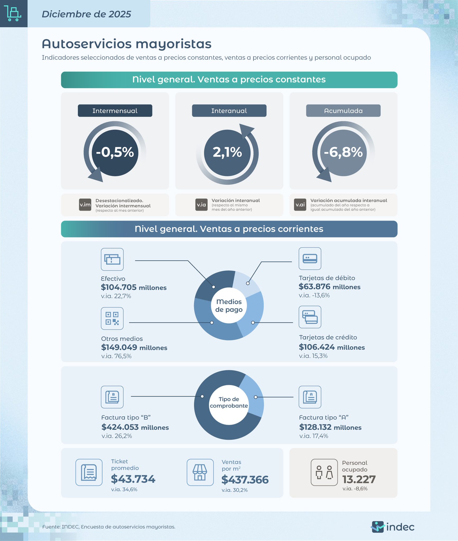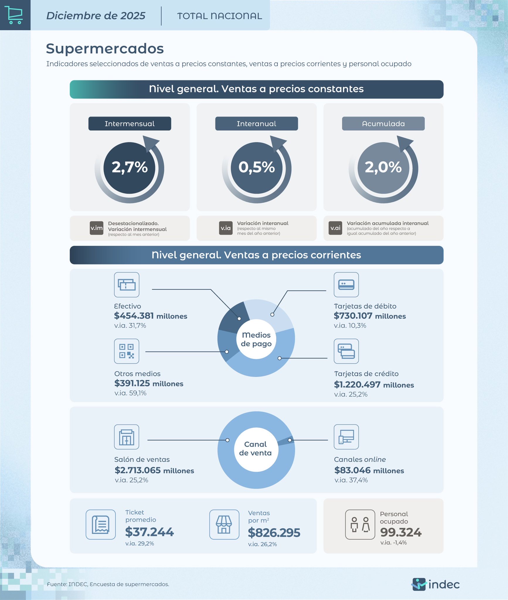 Las ventas en supermercados acumularon una suba de 2% en 2025