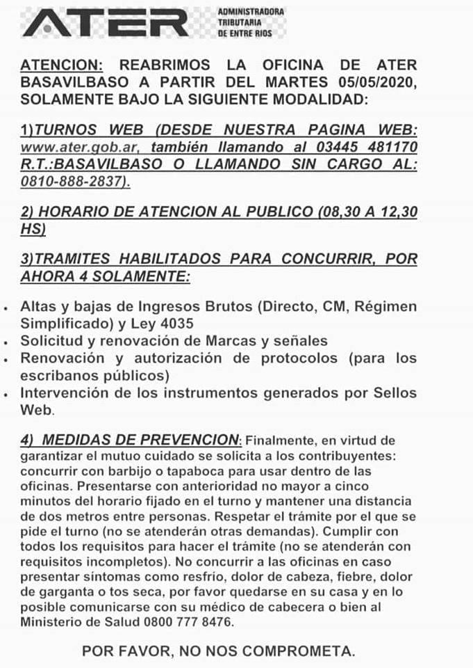 Según se informó la atención, de 8:30 a 12:30 será personalizada, con turnos previos vía web o telefónicos. La oficina local de ATER hizo conocer en un volante los detalles de cómo será la atención y qué trámites o gestiones se podrán realizar con este nuevo y transitorio esquema.