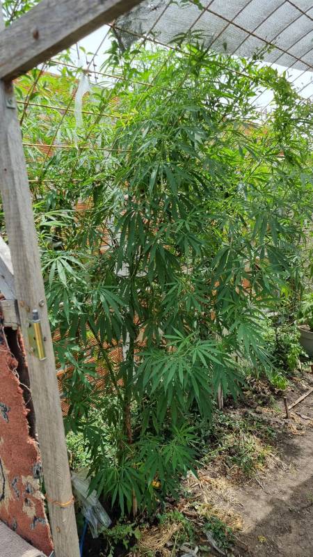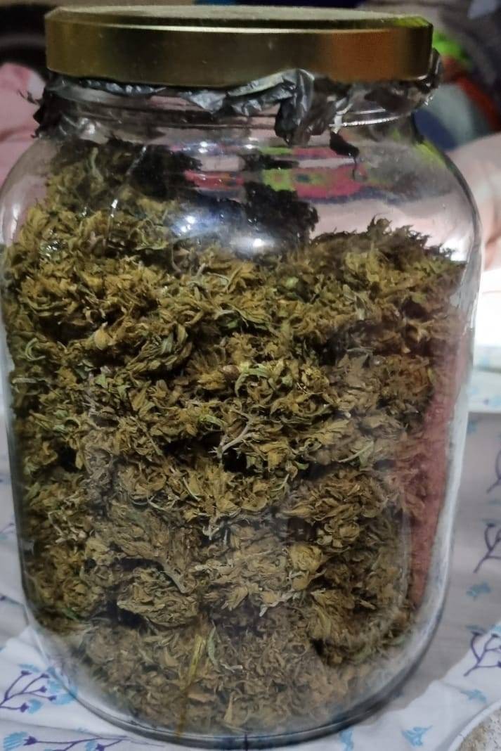 Según el funcionario ahi se encontraron con 25 plantas de iguales características, pero de diferentes tamaños, de lo que podría ser cannabis sativa (marihuana), mientras en el interior de la vivienda (en una de las habitaciones) en unos frascos grandes hallaron una sustancia vegetal verde amarronada que por su olor y características era similares a la de la especie cannabis sativa (comúnmente denominados cogollos).