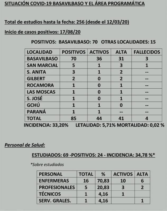 Los casos diagnosticados con el SARS-CoV-2 de Basavilbaso hasta este domingo suman 69 (1 de esos casos fue detectado en el hospital "Urquiza" y el resto en el "Sagrado Corazón de Jesús") de los cuales 37 son considerados al momento "activos" y el número de los recuperados asciende a 30.