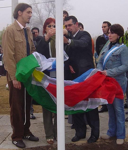 Luego el Intendente Horacio Fabián Flores, Maximiliano Barac, creador de la bandera, Concejales de ambas bancadas y el Diputado Julio Aldáz enarbolaron por primera vez la insignia -a las 11:07 horas de una muy fría mañana- en uno de los mástiles de la plazoleta de la rotonda de la calle Aguet y Avenida Perón.